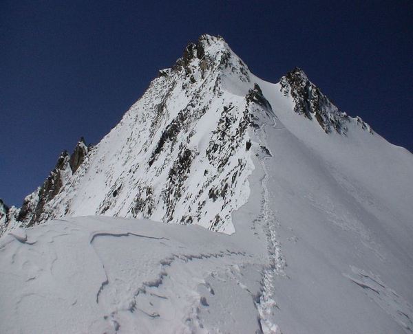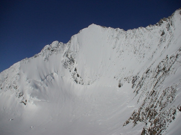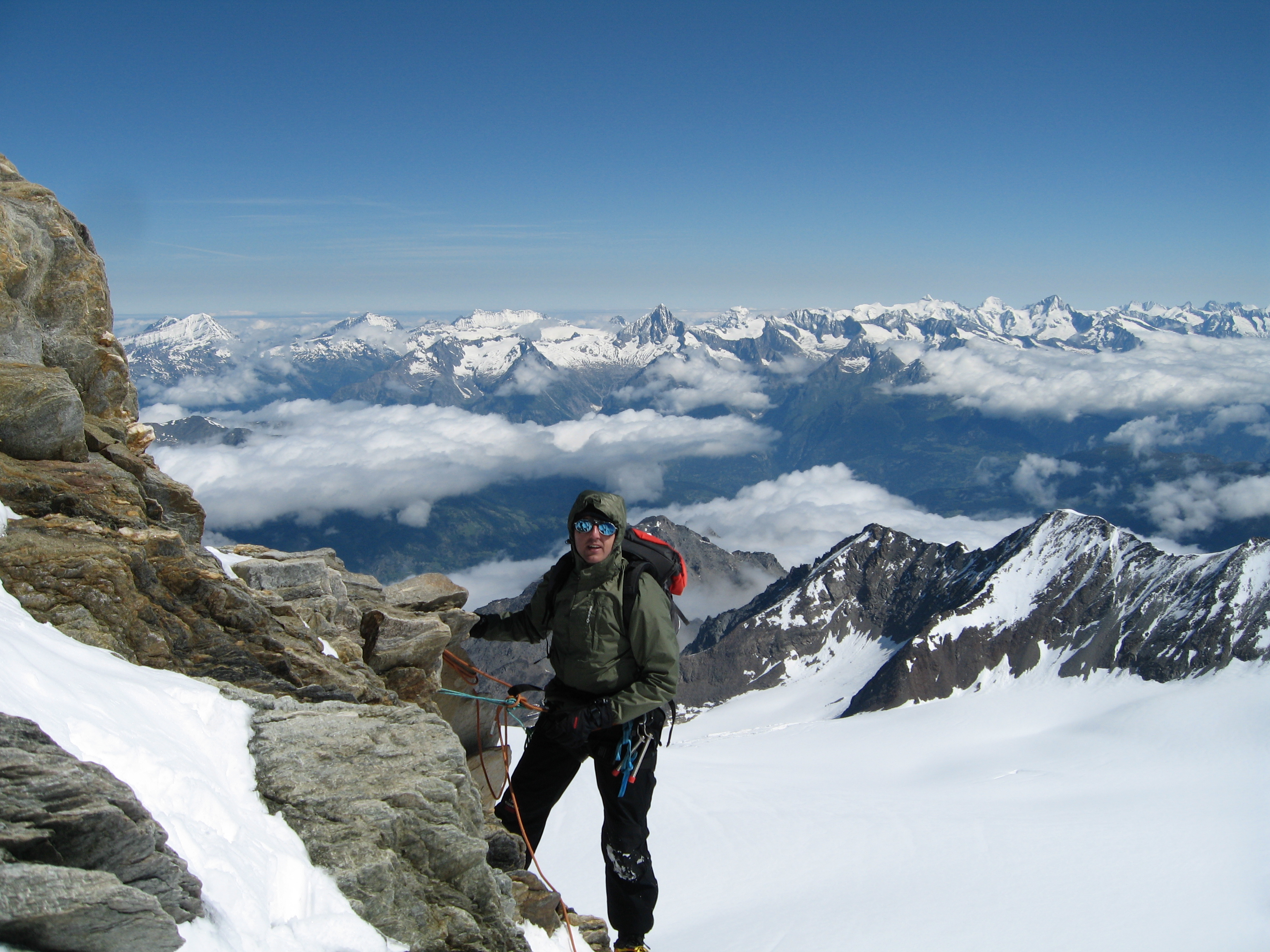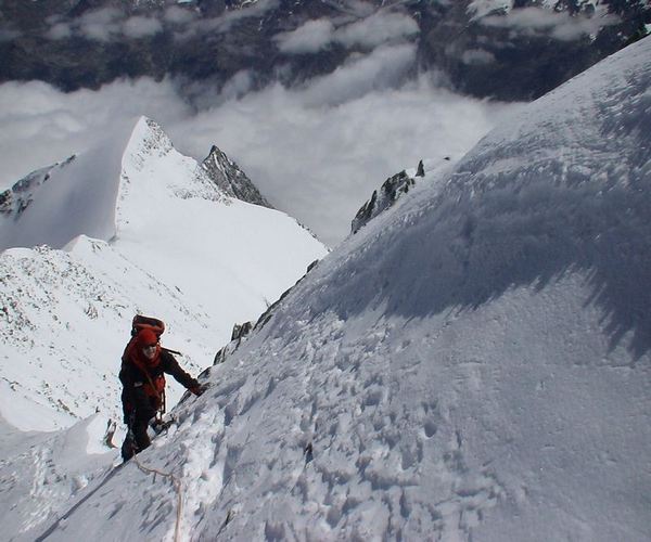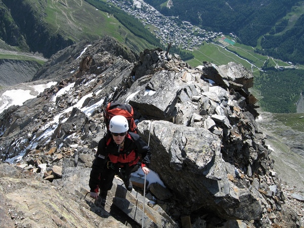 Η κορυφή Lenzspitze 4294 μέτρα, με την κλασσική διαδρομή της νοτιοανατολικής πλευράς, η κορυφογραμμή προς τα αριστερά που φτάνει μέχρι το Nadelhorn αποτελεί μια πολύ όμορφη αλπική διαδρομή. |