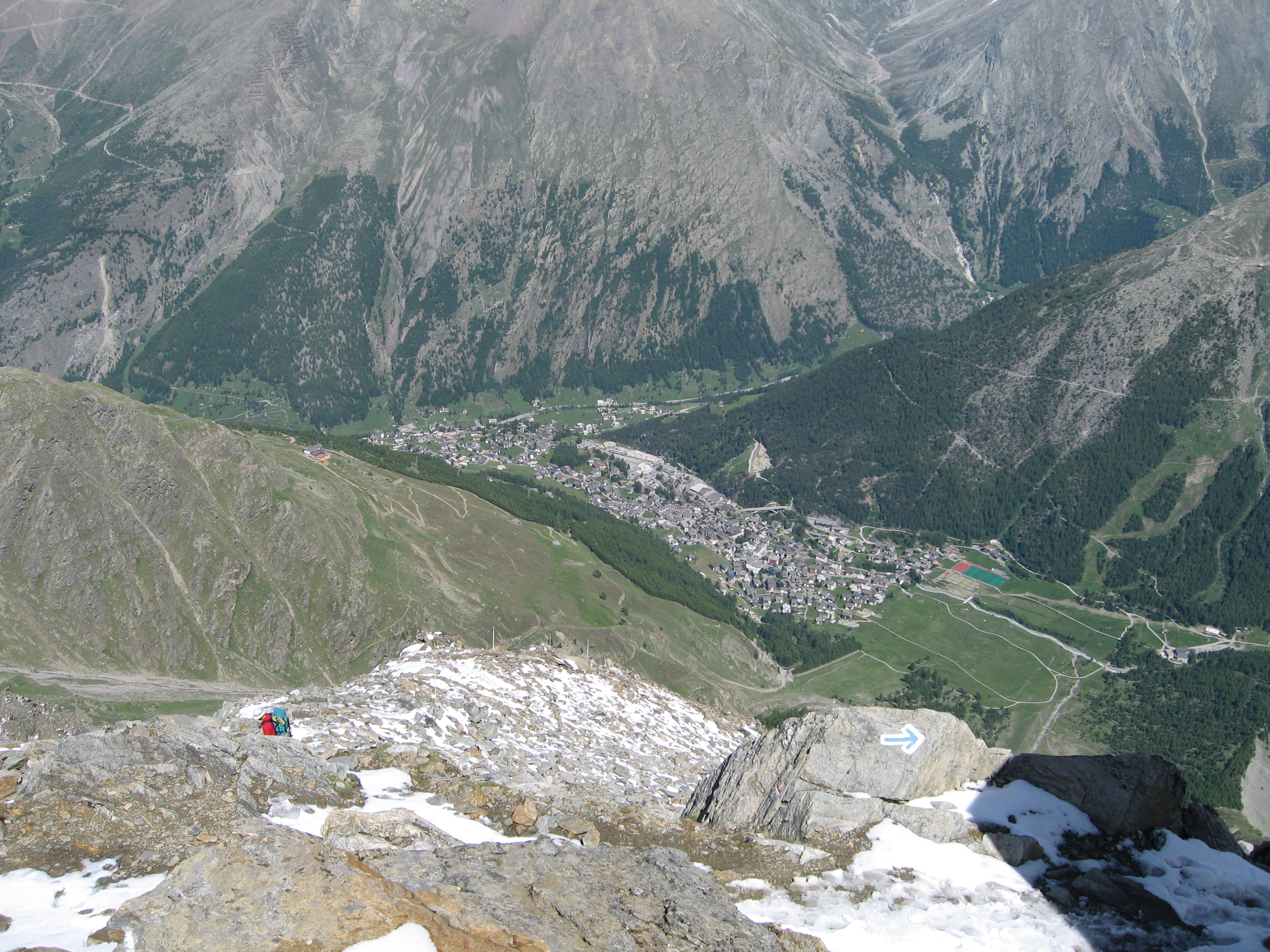Η Via Ferrata ξεκινά από τα 2600 μέτρα και φτάνει μέχρι και το καταφύγιο Mischabel 3340 μέτρα. Είναι η ευκολότερη διαδρομή προς το Nadelhorn, στο βάθος χαμηλά διακρίνεται το Saas Fee. |
