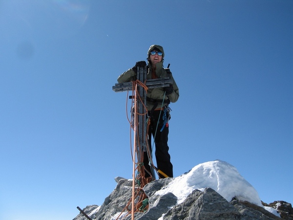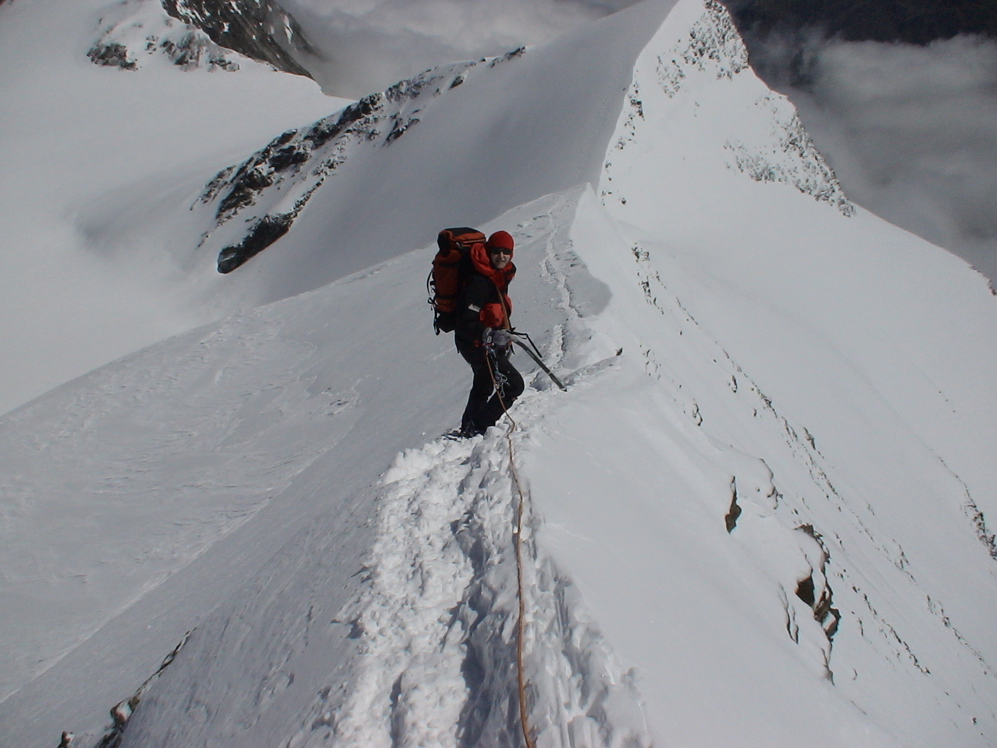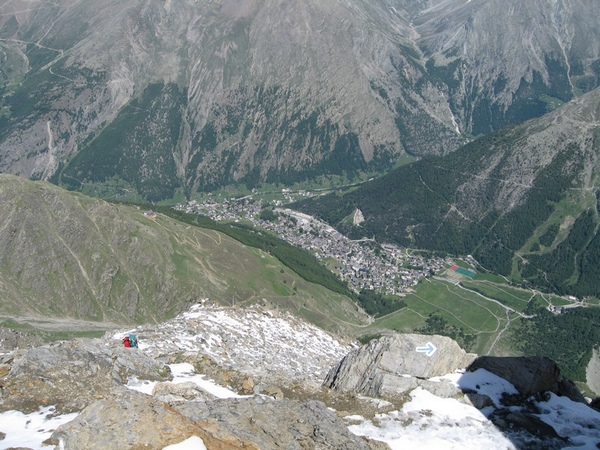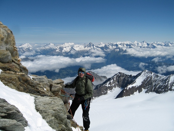 Στις 10:00 ήμαστε πλέον στο σημείο της κορυφής. Η θέα είναι καταπληκτική αλλά δεν έχει χώρο ούτε για να πατήσουμε. Ο Νίκος κάνει μια ασφάλεια στον μεγάλο σιδερένιο σταυρό της κορυφής. Βγάζουμε τις απαραίτητες φωτογραφίες. Στο βάθος προς τα βόρεια βλέπουμε το Matterhorn. Σύντομα αρχίζουμε την κατάβαση. Κατεβαίνω την απότομη πλαγιά με πιο πολύ αποφασιστικότητα. Διασχίζουμε την κόψη με προσοχή καθώς ο αέρας είναι δυνατός. Χάνουμε γρήγορα υψόμετρο και ο καιρός βελτιώνεται. Ακολουθούμε την ίδια διαδρομή και μπαίνουμε τον παγετώνα. Εδώ το χιόνι έχει μαλακώσει αρκετά εξαιτίας του δυνατού ήλιου και τα πόδια μας βουλιάζουν. |