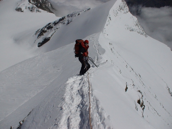 Πρωινό εγερτήριο στις 4.00. Ο Θανάσης δεν αισθάνεται καλά και αποφασίζει να μην έρθει. Εγώ με τον Νίκο ετοιμαζόμαστε και ξεκινάμε στις 5.00. Ακολουθούμε τα βήματα ενός οδηγού που είχε ξεκινήσει νωρίτερα. Το μονοπάτι είναι καλυμμένο με φρέσκο χιόνι. Δεν έχει φέξει ακόμα και κινούμαστε με τους φακούς. Ξημερώνει και έχει πιο πολύ κρύο. Το τοπίο στα 3.500 μέτρα είναι μοναδικό καθώς αρχίζουν να κοκκινίζουν οι ατελείωτες κορυφές. Ξεπροβάλουν μέσα από τα σύννεφα σαν νησάκια. Βρισκόμαστε ακόμα στη βράχινη ράχη που οδηγεί στον παγετώνα Riedgletscher. Σε λίγο βγαίνουμε στον παγετώνα και δενόμαστε. Δεν υπάρχουν εμφανείς κρεβάνς καθώς βρισκόμαστε πολύ ψηλά, σχεδόν στην αρχή του και έχει χιονίσει πρόσφατα. Σε λίγο φτάνει η ομάδα των Γερμανών που ήταν πίσω μας. Συνεχίσαμε να ανεβαίνουμε μαζί μέχρι τον ανατολικό αυχένα του Nadelhorn. Η διαδρομή είναι η βορειοανατολική ράχη που γίνεται σύντομα κοφτερή και δύσκολη με αρκετά βράχινα περάσματα. Έχει δυνατό κρύο αέρα με λίγα σύννεφα ψηλά. Περπατάμε στα βόρεια της ράχης για να αποφύγουμε την κορνίζα. Το οξυγόνο λιγοστεύει στα 4.000 μέτρα και πρέπει να προσέχουμε πολύ τις κινήσεις μας (δυσκολία PD). Η πυραμίδα της κορυφής είναι βράχια με δυσκολία ΙΙΙ αλλά είναι καλυμμένα με φρέσκο χιόνι (όχι σταθερό) κάτι που κάνει την προσπάθεια μας πολύ δυσκολότερη. Περιμένουμε τους γερμανούς να τελειώσουν την προσπάθεια τους γιατί το τελευταίο κομμάτι προς την κορυφή είναι πολύ στενό και απότομο. Ο Νίκος κάνει περιοδικές ασφάλειες. Καρφώνω το πιολέ χωρίς να κοιτάω προς τα κάτω την ατελείωτη πλαγιά που φτάνει τα χίλια μέτρα βάθος. Η αυτοσυγκέντρωση μου φτάνει στα όρια της και κάθε φορά που χτυπάω τα γκραμπόν και το πιολέ ελέγχω διπλά τις κινήσεις μου. |